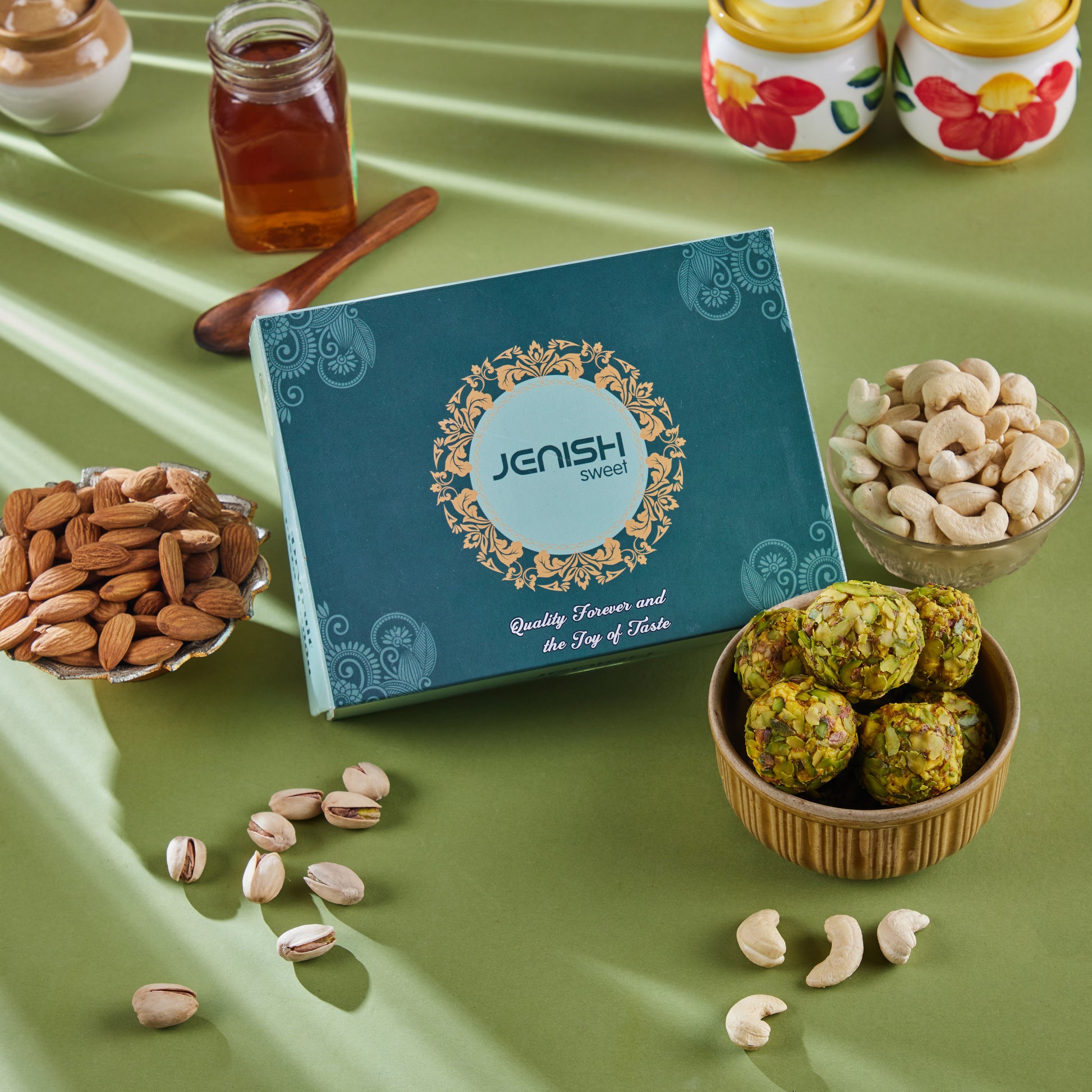 Delight in the exquisite flavors of Dryfruit Pista Laddu, a  delicacy from Gujarat revered for its luxurious taste and nutritional benefits. Experience the luscious blend of gulkand and honey, harmoniously melted in  Gir Cow Ghee, enhanced with a generous medley of crunchy cashews, almonds, and adorned with Pistachio chip. Whether commemorating special moments or adhering to dietary preferences, this premium sweet is an ideal treat to share with loved ones. Handcrafted fresh for every order, using 100% natural ingredients including almonds, cashews, pistachios, gulkand, honey, Gir Cow Ghee, and  Pistachio chip, each bite embodies the essence of tradition and culinary excellence.